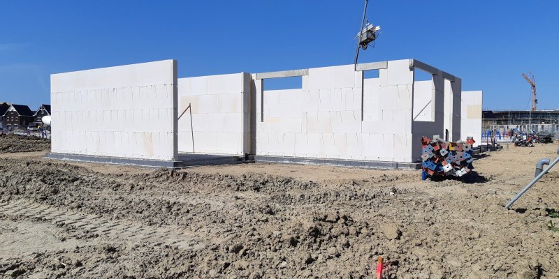 Nadat de vloeren klaar waren is er gestart met de eerste binnenmuren in het Kamgras (Vlek-3 Blok-26). Omdat alle blokken al op maat aankomen gaat het bouwen erg snel . Het lijkt wel op Lego ;)