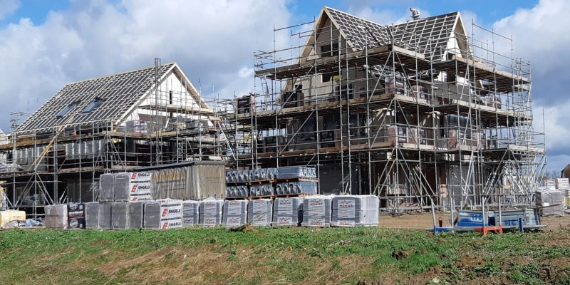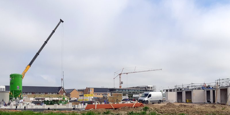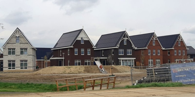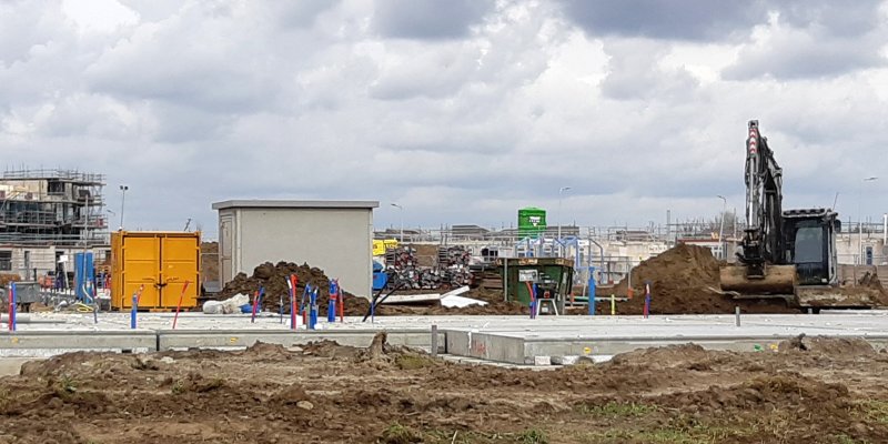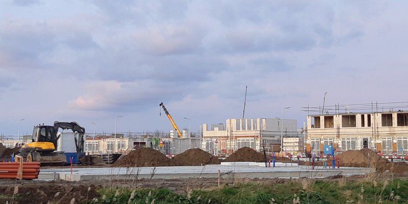 Bij de eerste huizen van het project liggen de daken er op en krijgt de wijk daar al echt vorm.