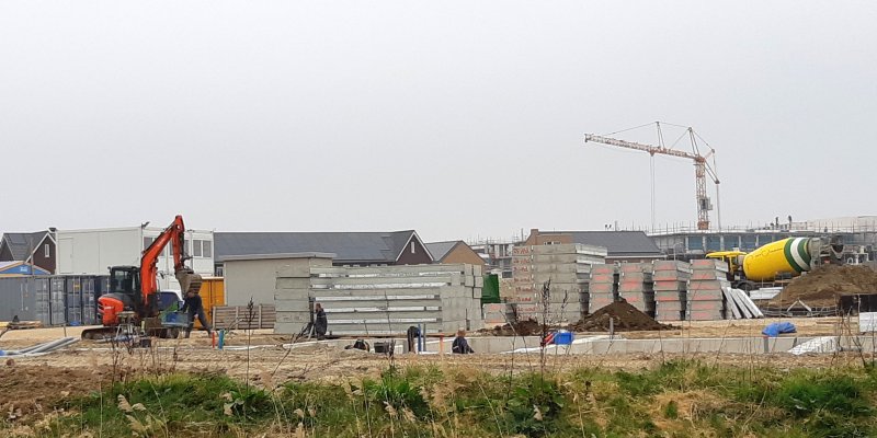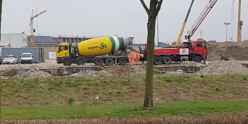Alles was er klaar voor, dus vanmorgen is er gestart met het het storten van de funderingen van de patio-woningen aan het Borstelgras.