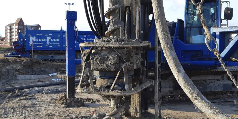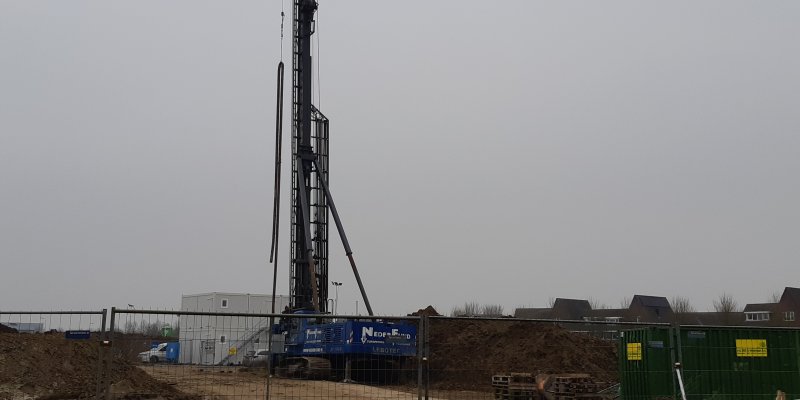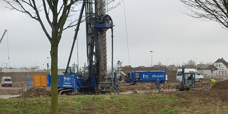 De machine waarmee de palen geboord moeten worden is gearriveerd op het Borstelgras. Ook de bewapening voor de palen is al afgeleverd bij de woningen van het Borstel gras.