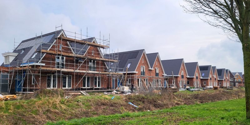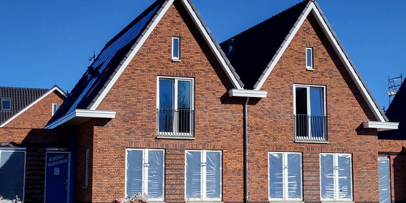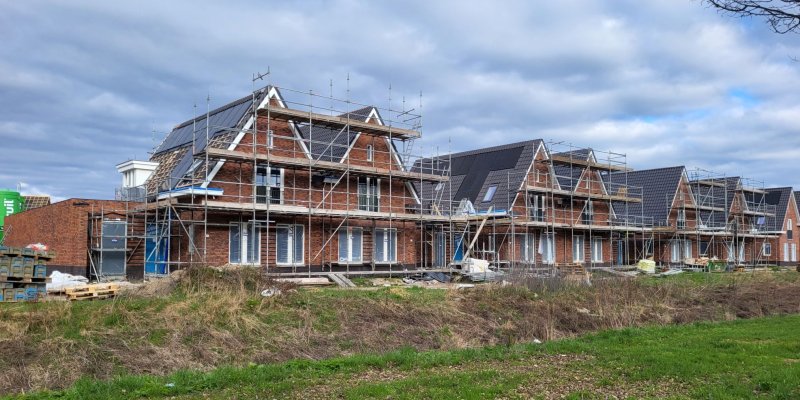 Ook Blok-31 is bijna in zijn geheel onder de pannen. Nog 1 dakvlak moet nog gedaan worden. De nokvorsten zijn hier op het eerste huis al geplaatst. De rest zal komende week volgen.