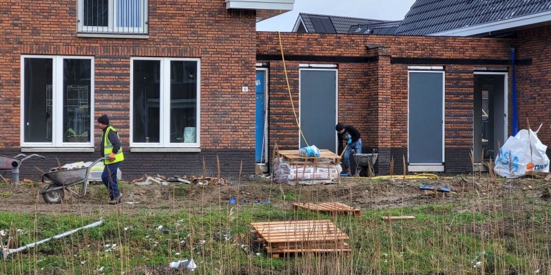 Ondanks dat het weekend is waren er veel mensen op de bouw aan het werk. Het straatje voor Blok-30 wordt opgeruimd zodat er begonnen kan worden met het aanleggen van de nutsvoorzieningen. Hierna kunnen de stoep en muurtjes voor de woningen aangelegd worden.