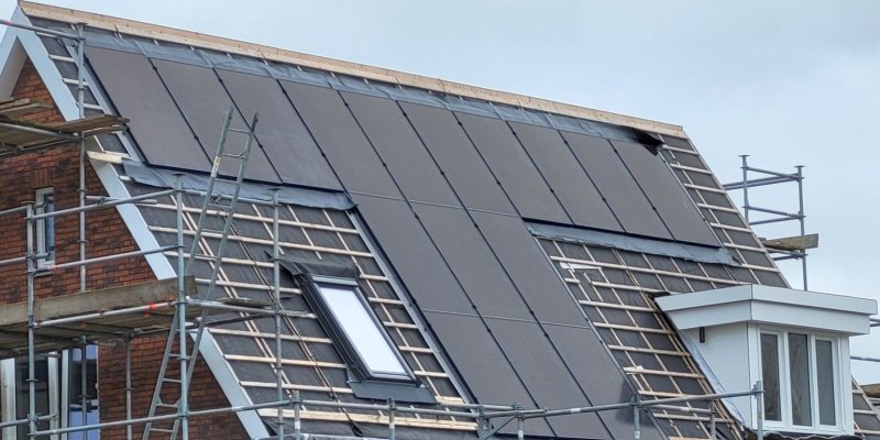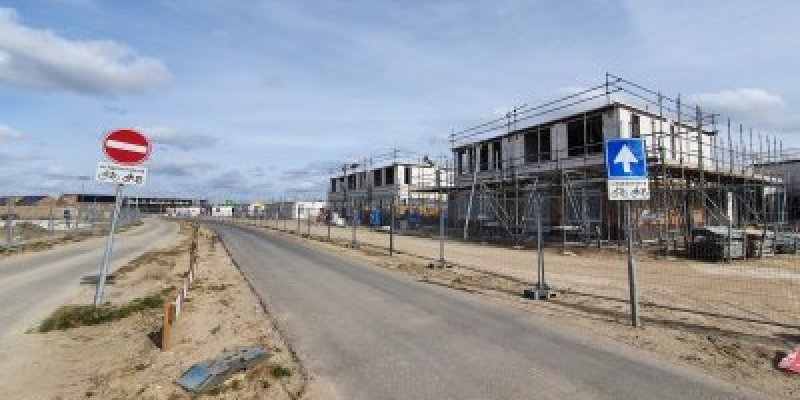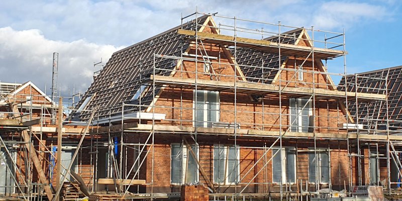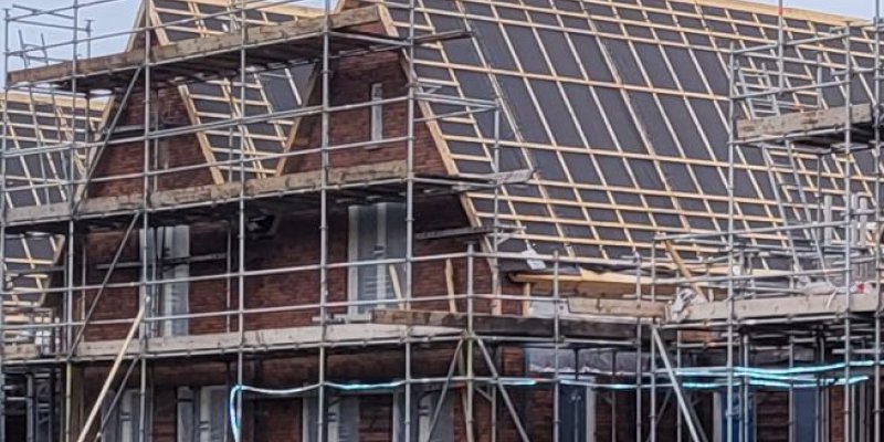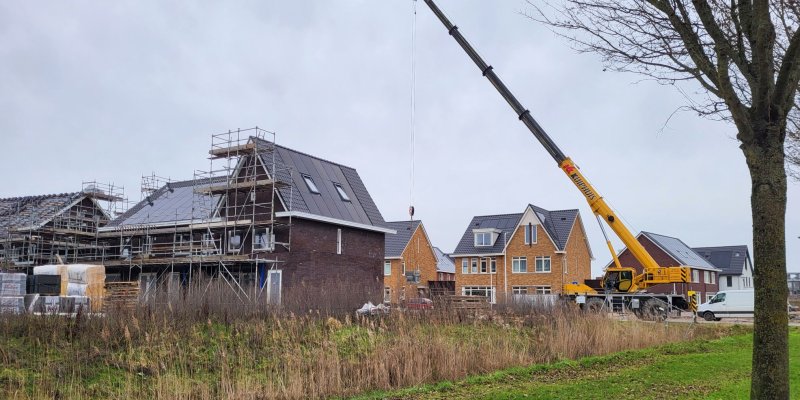 Op de huizen achter het Borstelgras gaat het werk ook door. Hier zijn de daken inmiddels voorzien van dakpannen en zonnepanelen.