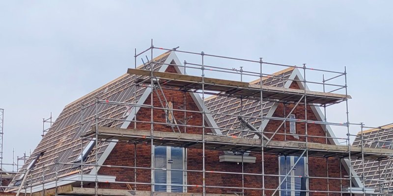De laatste stukjes goot tussen woningen de daklijsten zijn geplaatst.