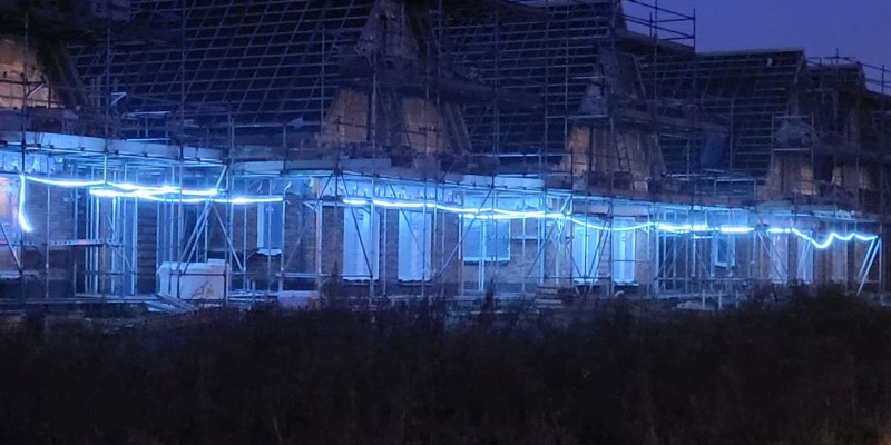 Het zijn inderdaad de donkere dagen voor Kerst. Desondanks wordt er door gemetseld bij kunstlicht. De eerste twee gevels van Blok-30 zijn klaar. De resterende volgen gestaag.