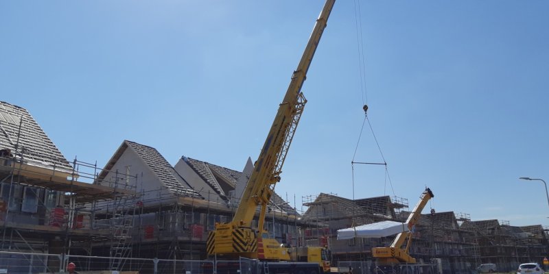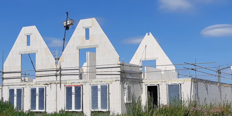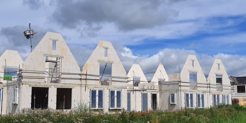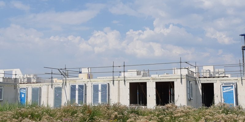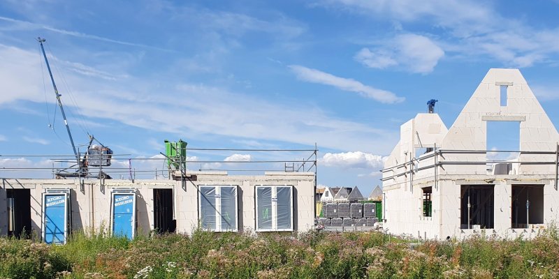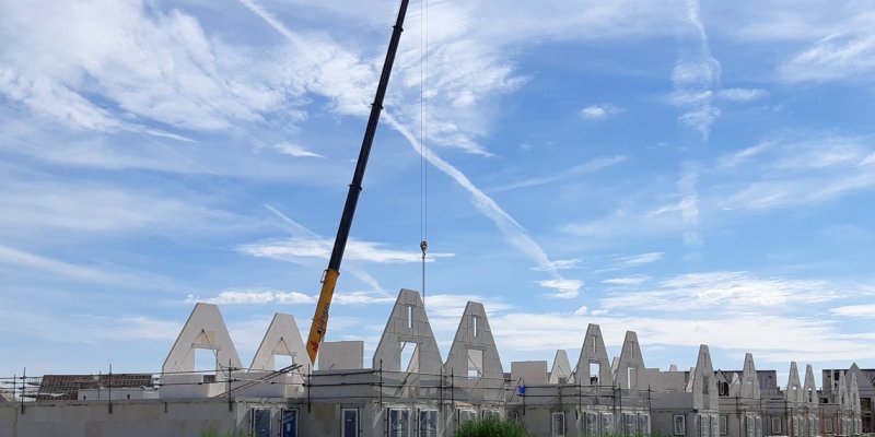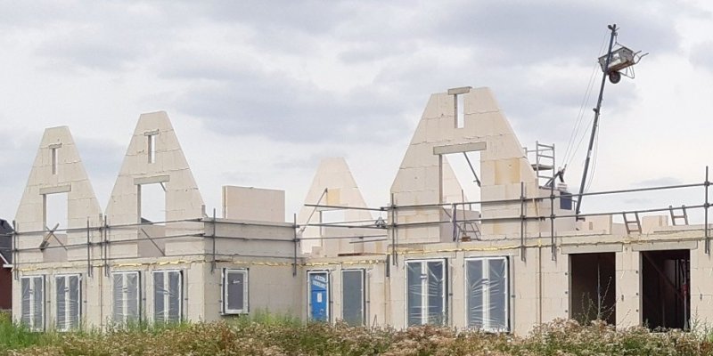 Soms is het even rustig en soms gebeurt er ineens veel. Vandaag zijn de eerste voorgevels en binnenmuren geplaatst op de verdieping van de woningen (Blok-30).